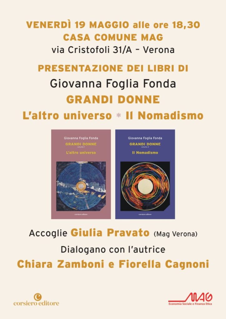 Abbiamo accolto e valorizzato il desiderio di Giovanna Foglia di presentare, con il prezioso apporto dell’amica Fiorella Cagnoni, i primi due libri da lei scritti che fanno parte di una saga intitolata “Grandi Donne”: L’altro universo e Il nomadismo (Corsiero editore, Reggio Emilia 2023). Giovanna e Fiorella sono creatrici e fondatrici di luoghi e progetti creati dalle donne per tutte le donne: l’Alveare di Milano e di Lecce che favoriscono l’incontro, lo scambio e la relazione, luoghi di accoglienza e condivisione, di studio, divertimenti, formazione, dove poter esprimere desideri e talenti; il Trust “Nel nome della Donna” che dieci anni fa ha sostenuto la Mag di Verona, impegnata a realizzare un convegno nazionale intitolato “Beni comuni per le realtà locali e oltre” (17.5.2013), dove restituire il senso e i risultati di un importante lavoro di ricerca sulle imprese sociali come bene comune, ispirato ai criteri politici ed economici elaborati da Elinor Ostrom (1933-2012), politologa economista statunitense, premio Nobel 2009.