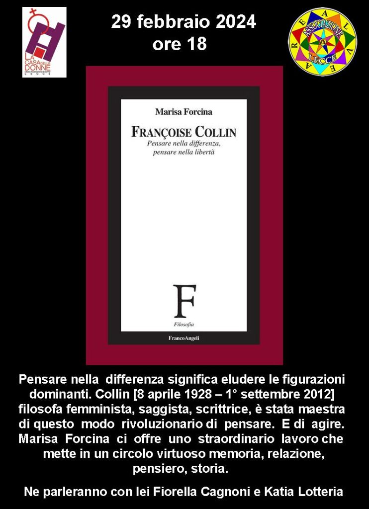 Se nel giorno più stravagante dell’anno, il 29 febbraio, verrai all’Alveare di Lecce, in via Ciro Pezzella, in fondo alla strada, potrai partecipare alla 𝐩𝐫𝐞𝐬𝐞𝐧𝐭𝐚𝐳𝐢𝐨𝐧𝐞 𝐝𝐞𝐥 𝐥𝐢𝐛𝐫𝐨 che Marisa Forcina, filosofa, ha dedicato a Françoise Collin, filosofa.