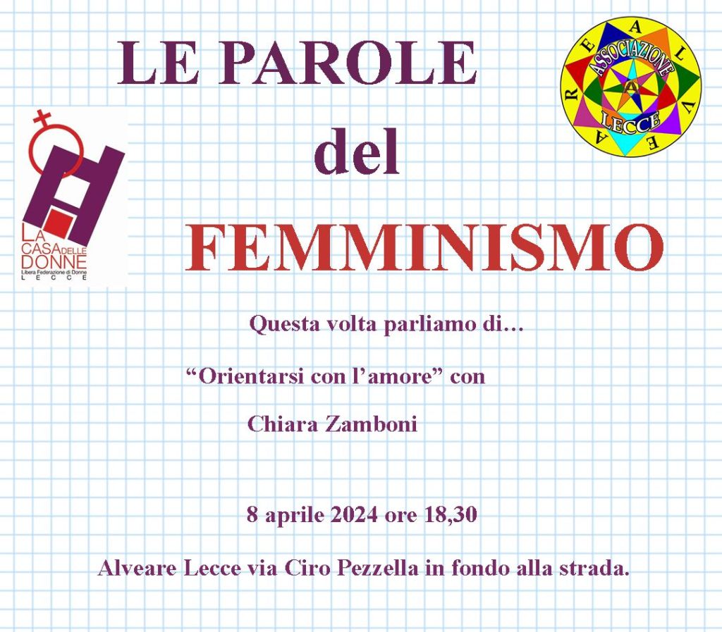Lunedì 8 aprile 2024 ore 18,30 Le Parole del femminismo a cura di Alveare Lecce e Casa delle Donne di Lecce.
