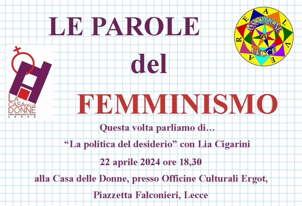 Lunedì 22 aprile 2024 ore 18,30 Le Parole del femminismo a cura di Alveare Lecce e Casa delle Donne di Lecce.
