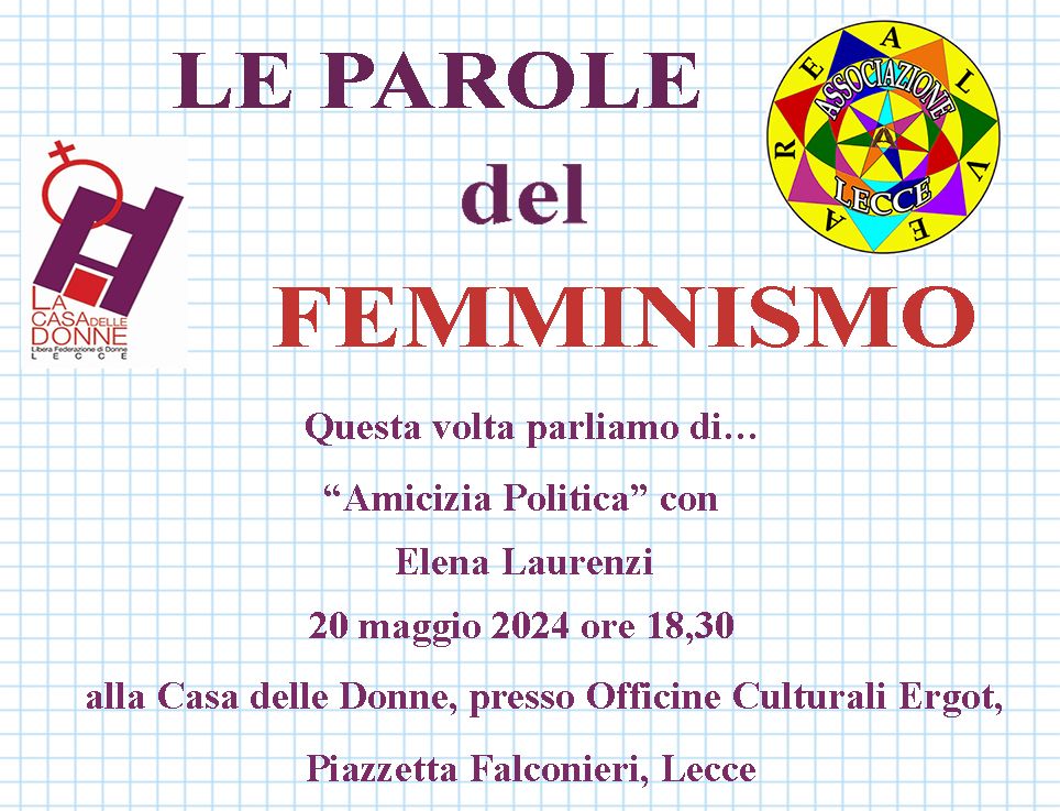 Lunedì 20 maggio 2024 ore 18,30 Le Parole del femminismo a cura di Alveare Lecce e Casa delle Donne di Lecce.