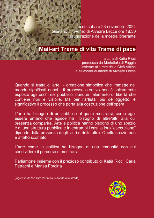 Sabato 23 novembre, Giardino d’Inverno di Alveare Lecce, ore 18,30, inaugurazione della mostra itinerante Mail-art Trame di vita Trame di pace, a cura di Katia Ricci, promossa da Merlettaia di Foggia insieme alla rete delle Città Vicine e all’Atelier di artiste di Alveare Lecce.