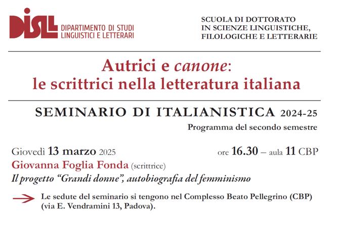 Continua il13 marzo a Padova con il Seminario di italianistica “Autrici e canone: le scrittrici nella letteratura italiana”.